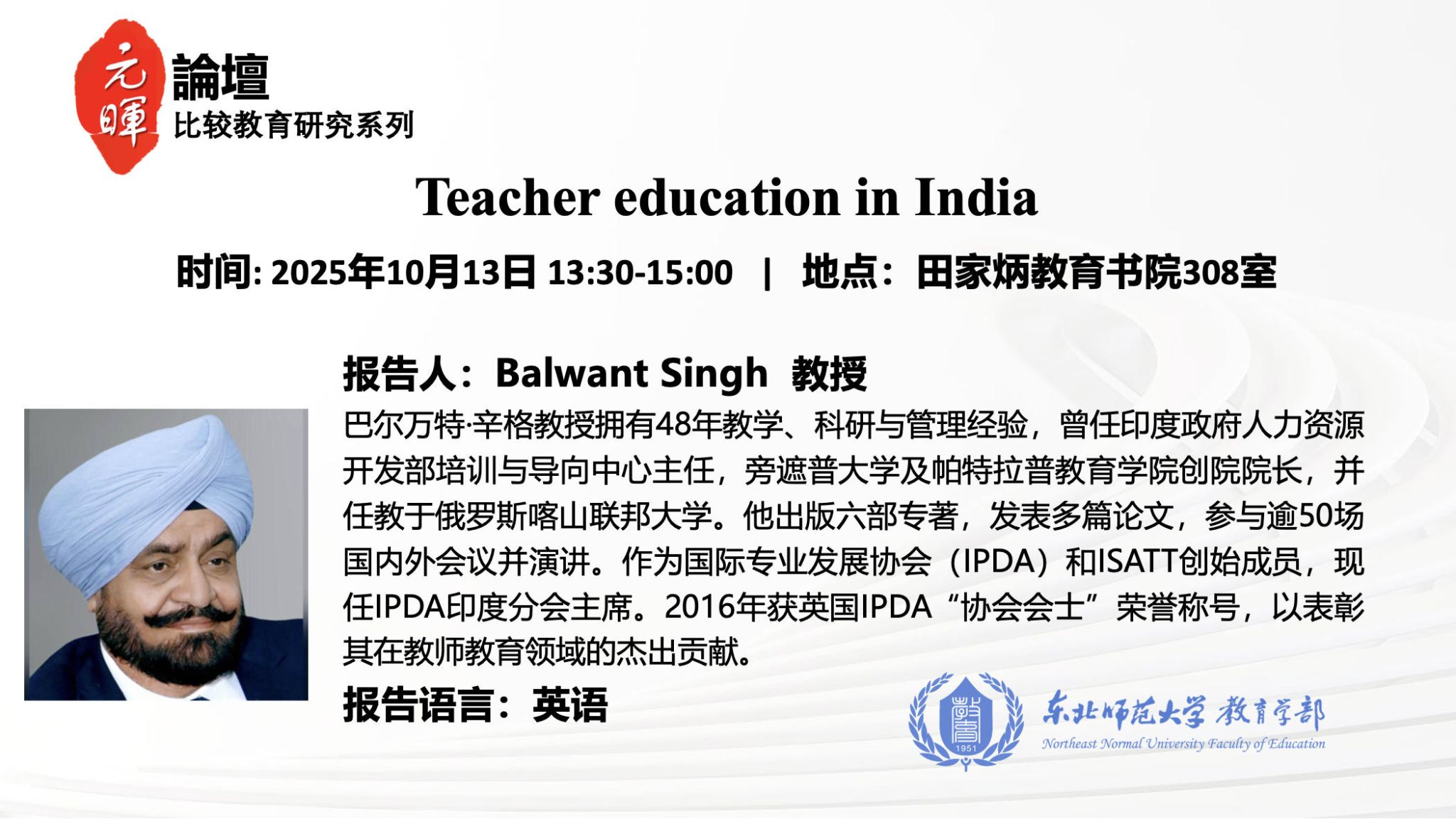 【元晖论坛—比较教育研究系列】Balwant Singh:Teacher education in India