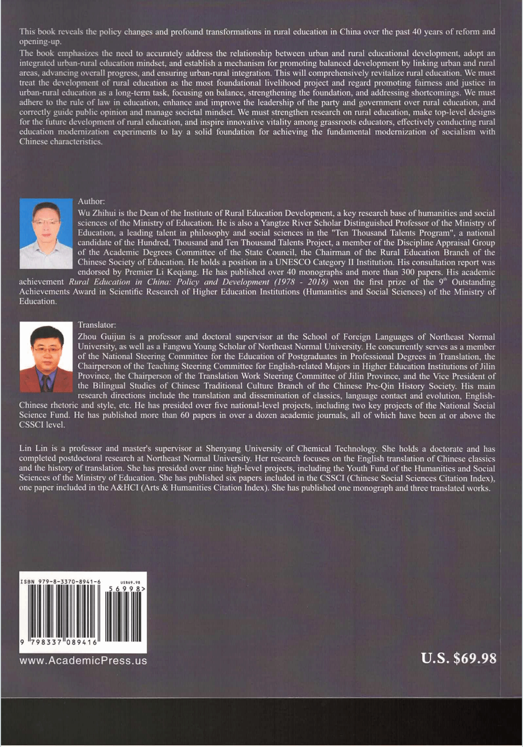 近日,学部邬志辉教授领衔撰写、外国语学院周桂君教授主持翻译的学术著作《中国农村教育:政策与发展1978-2018》英文翻译版在美国学术出版社(American Academic Press)出版。该著作中文版于2018年在中国社会科学文献出版社出版,入选纪念改革开放40周年研究丛书。著作通过全面梳解改革开放40年农村教育深刻变化,真实还原农村教育事实场景,深入透析农村教育变迁学理,建构农村教育学知识体系,试图解开中国农村教育健康快速发展之谜。2024年,该著作获第九届高等学校科学研究优秀成果奖(人文社会科学)一等奖。