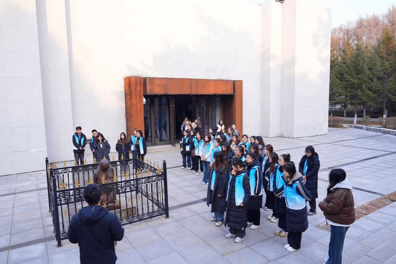 最后一站,学子们来到辽源矿工纪念馆。高大的 “矿工魂” 纪念碑庄严肃穆,在夕阳下更显厚重。怀着无比崇敬的心情,学子们在纪念馆前整齐列队,举起右拳,重温入团誓词:“我志愿加入中国共产主义青年团,坚决拥护中国共产党的领导…… 为共产主义事业而奋斗!” 铿锵有力的誓言回荡在纪念馆上空,既是对革命先辈的告慰,更是对青春使命的承诺。在陈列馆中,学子们了解到,近代以来,辽源矿工遭受三重压迫,在暗无天日的矿井下冒死开采,许多人因劳累、事故或迫害长眠于此。随后,全体师生在矿工尸骸纪念区肃立,进行一分钟默哀。微风轻拂,草木静立,现场鸦雀无声,学子们在静默中缅怀逝去的矿工先辈,感悟他们无私奉献的精神真谛,更坚定了传承先辈遗志、勇担时代使命的信念。